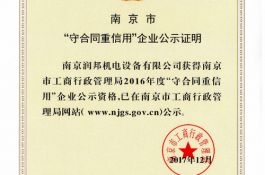 2017年12月29日,接到南京市企業(yè)信用管理協(xié)會(huì)通知,潤(rùn)邦公司再次通過(guò)2016年度市級(jí)“守合同重信用”企業(yè)的認(rèn)定。誠(chéng)信潤(rùn)邦,傾心服務(wù)。潤(rùn)邦始終把合同管理、信用